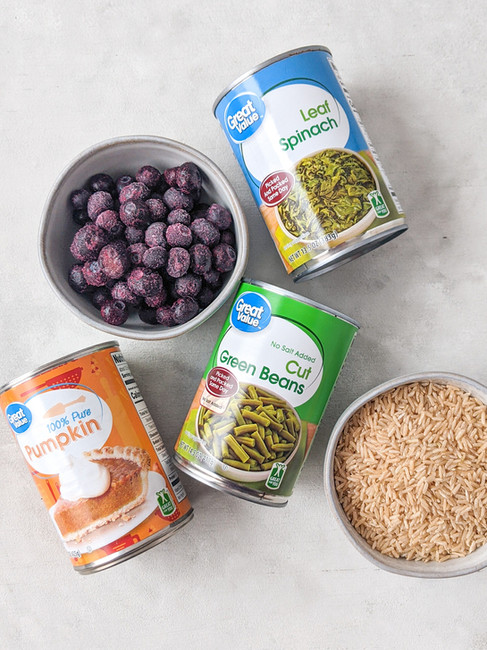 Brown rice is a whole grain added for fiber and better digestion. Pumpkin is great also for digestion for pets, and it adds vitamins like A and C as well. Blueberries add antioxidants. Green beans and spinach are great for more fiber and several vitamins and minerals like vitamin K and iron. Not all pets like spinach so this is an optional addition. Note if you do add canned spinach, you will not need to add all the extra water.