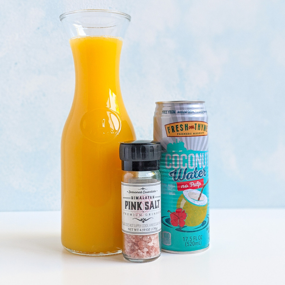 Coconut water adds potassium, sodium, and magnesium which helps with hydration, the Himalayan pink salt adds more sodium to help restore electrolytes and increases your thirst so that you drink more water, and orange juice adds fruity flavor, sugar for restoring energy, and vitamin C. You can also use pineapple juice but it contains less vitamin C. Make sure to use juice that has no added sugar or other ingredients.