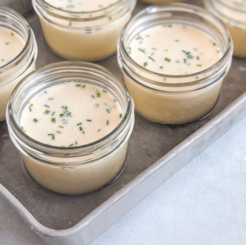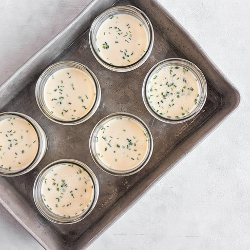 Use 4 ounce canning jars, do not use larger ones. Add your egg mixture to 6 jars so that they are about 3/4 full or slightly more. You do not want your jars full to the top because the egg while puff when cooked, and less than 3/4 full may make the jar explode in the water.